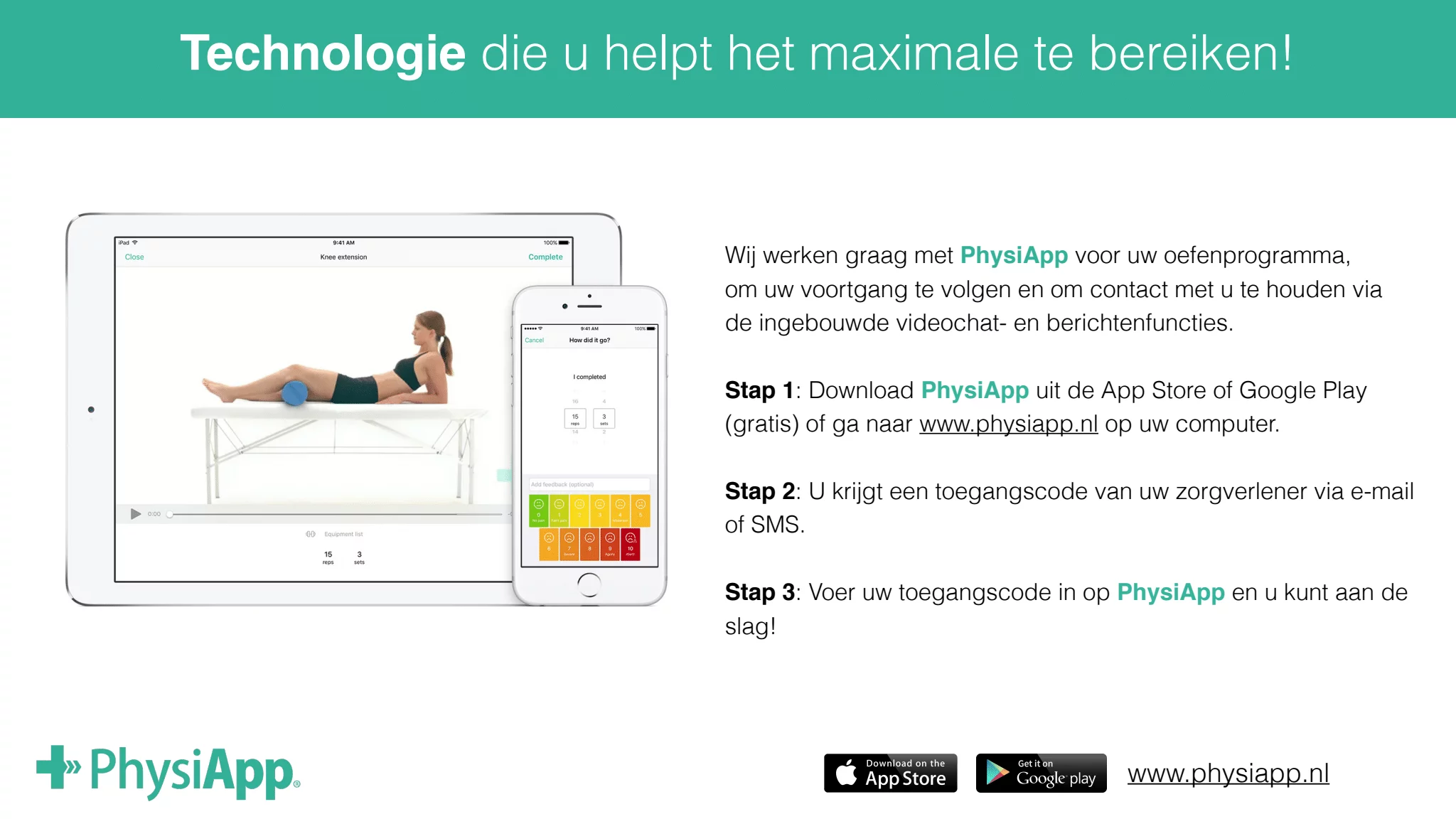 Bij Health Center Plantinga werken we graag met de nieuwste technologie om de beste resultaten te behalen. Daarom werken wij voor uw huiswerkoefeningen en trainingsschema’s met PhysiApp. Met PhysiApp voert u oefeningen precies goed uit door kristalheldere, Nederlands gesproken oefenvideo’s. PhysiApp kunt u gratis downloaden uit de App Store en Google Play Store of kunt u via uw browser bekijken. U kunt zelfs herinneringen instellen om zo op schema te blijven. Zo blijven wij samen met u werken aan de beste behandelresultaten!